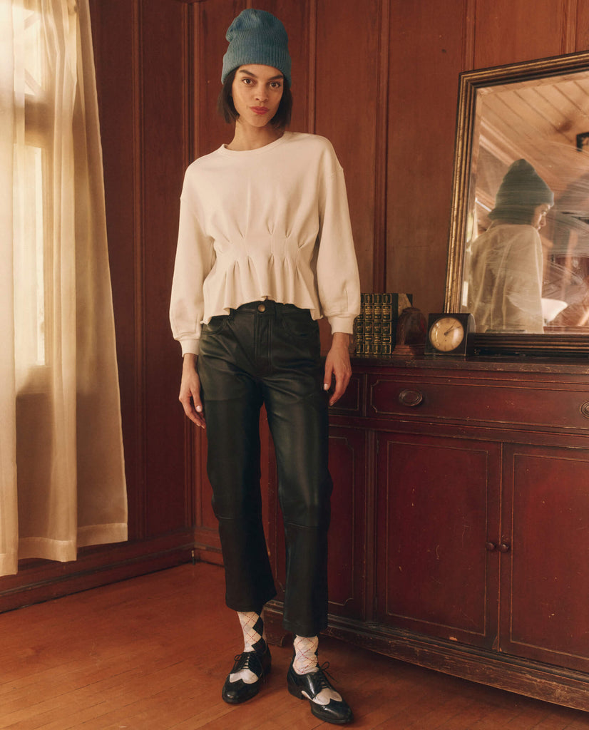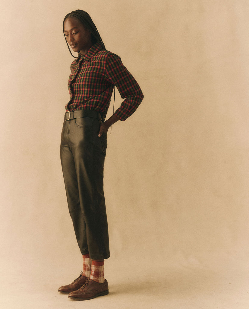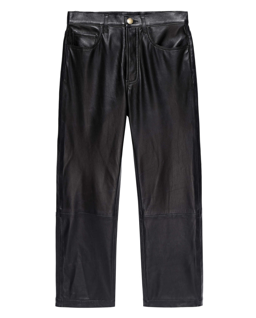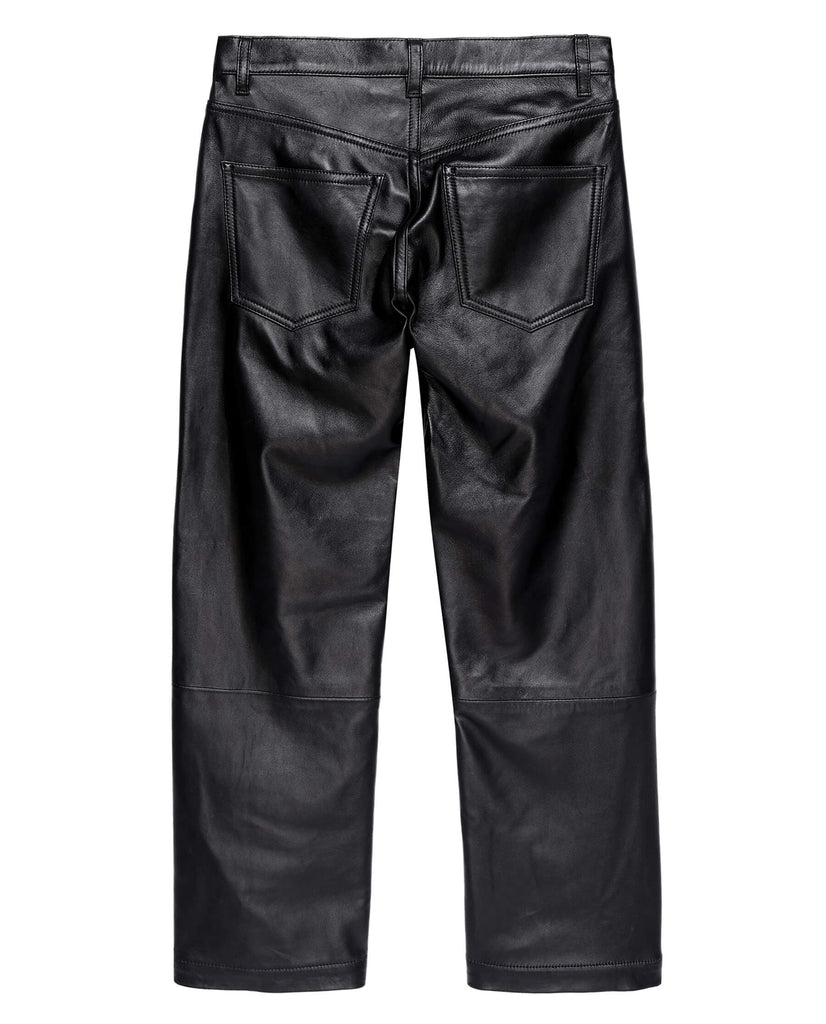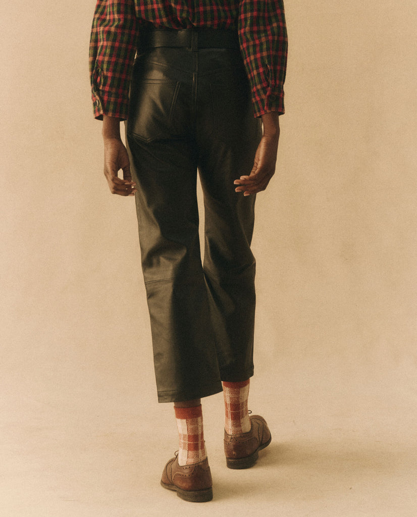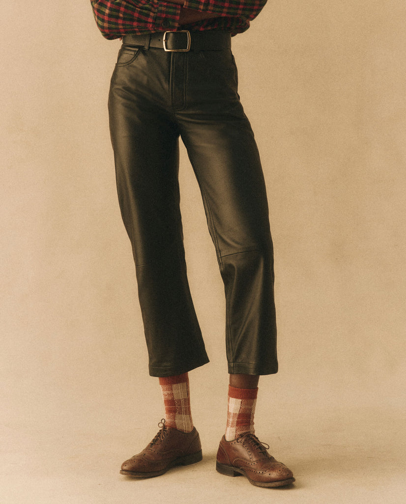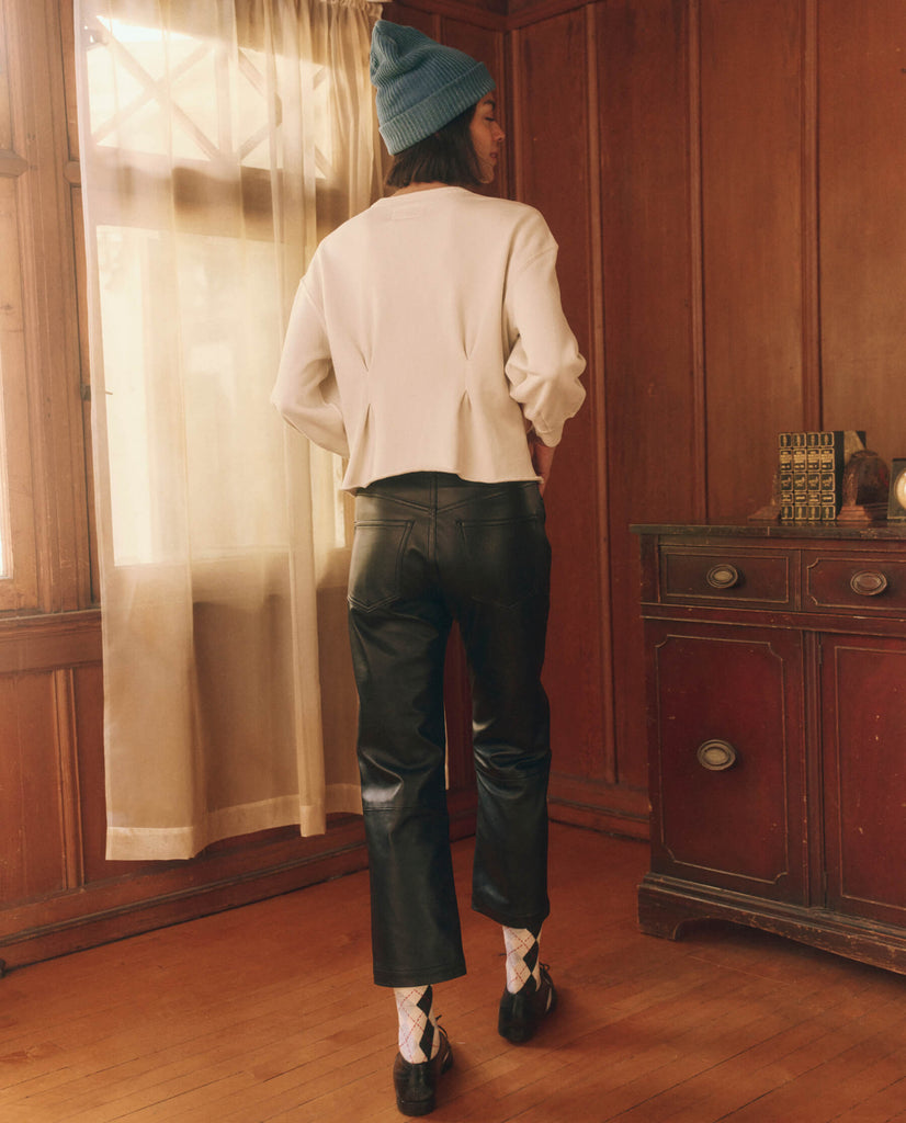 The Wayne Jean. is our favorite slouchy body updated for the festive season in soft leather. Inspired by—and named for—Emily’s late father. This is a cherished fit that gets better with age...just like its namesake. This pant fits easy through the leg andis cropped to the perfect length. Wear The Leather Wayne. true to size at the natural waist or size up to wear them oversized and slung low, like borrowing his favorite pair.