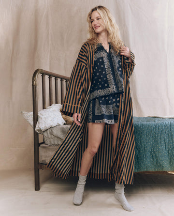 Spend a morning in The Robe.-crafted from the softest 100% cotton in this seasons Club Stripe Print. This loungewear staple has a roomy fit, delicate contrast piping around the neckband and sleeves, the perfect low-calf length, and a secure waist tie. Its voluminous wide sleeves make this dreamy piece extra special.