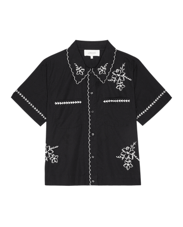 - Relaxed, square-cut fit with a V-neck and front placket, finished with adjustable shoulder straps and heirloom-inspired scalloped edges and embroidery.